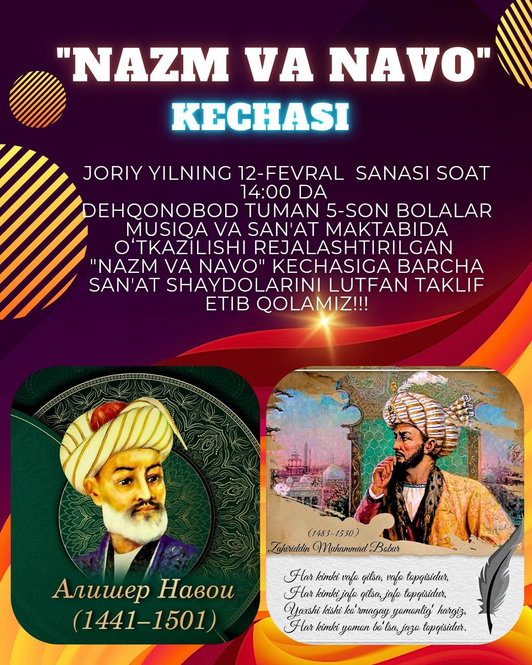 Joriy yilning 12-fevral sanasi soat 14:00 da Dehqonobod tuman 5-son Bolalar musiqa va sanʼat maktabida oʻtkazilishi rejalashtirilgan «Nazm va navo» kechasiga barcha sanʼat shaydolarini lutfan taklif etib qolamiz!!!