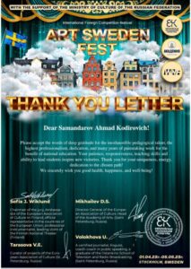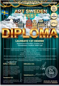 Dehqonobod tuman 5-son BMSM O‘zbek xalq cholg‘u asboblari bo‘limi «dutor» sinfi o‘quvchisi Sattorova Umida, «g‘ijjak» sinfi o‘quvchisi Nurmahmatov Ozodbek va teatr san‘ati bo‘limi o‘quvchisi Hazratqulov Sardorlar Shvetsiya va Rossiya hamkorlikda tashkil etilgan «ART SHWEDEN FEST» xalqaro onlayn tanloviga qatnashib faxrli 🥇 o‘rinni egalladilar. Ularning ustozlari tashakkurnoma bilan taqdirlandi. O‘quvchilarning kelajakdagi o‘qishlariga omadlar tilaymiz.