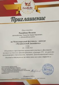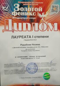 Dehqonobod tuman 5 son BMSM o‘quvchisi Rajabova Nozima Rossiya federatsiyasi Sankt-Peterburg shahrida 24-26 mart 2023 yil o‘tkazilgan xalqaro «ZOLOTOY FENIKS» oflayn konkurs festivalga qatnashib faxrli 1 darajali diplom hamda 2023 yil 20-23 iyun kunlari Sochi shahrida bo‘lib o‘tadigan «Muzikalniy disneyland»xalqaro konkurs festivalga taklifnomani qo‘lga kiritdi.
