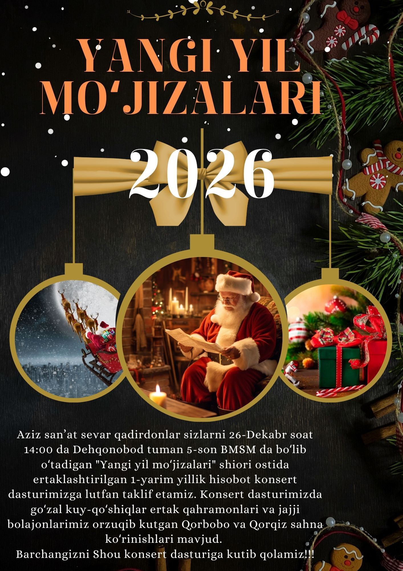 joyriy yilning 26-Dekabr soat 14:00 da Dehqonobod tuman 5-son BMSM da boʻlib oʻtadigan «Yangi yil moʻjizalari» shiori ostida ertaklashtirilgan 1-yarim yillik hisobot konsert dasturimizga lutfan taklif etamiz. Konsert dasturimizda goʻzal kuy-qoʻshiqlar ertak qahramonlari va jajji bolajonlarimiz orzuqib kutgan Qorbobo va Qorqiz sahna koʻrinishlari mavjud.